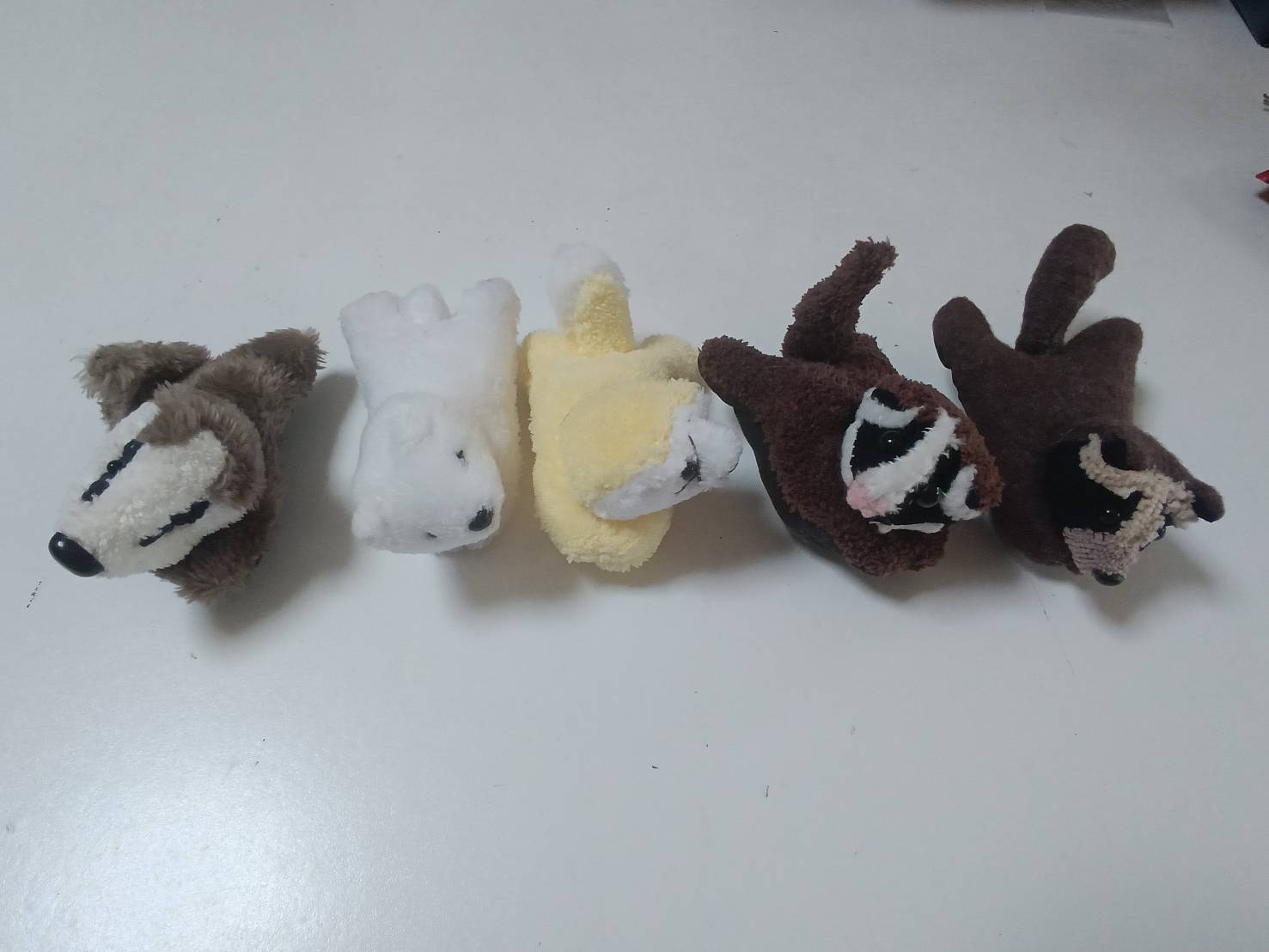 左からアナグマ、シロクマ、オコジョ、ハクビシン、タヌキ